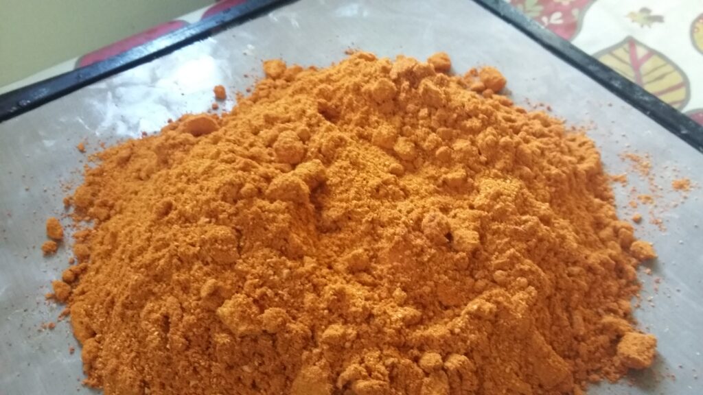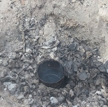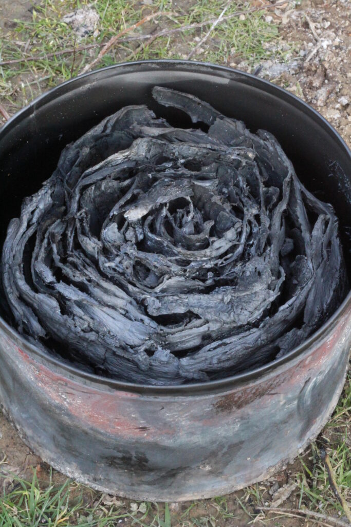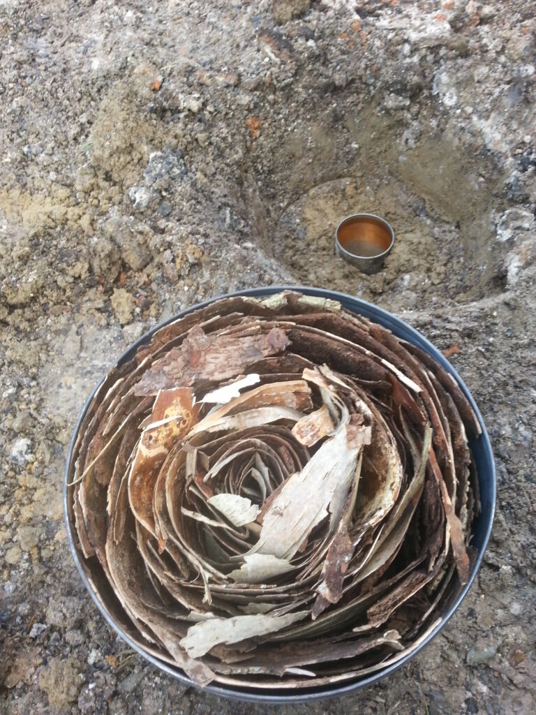 Collect lots of birch bark from well rotted fallen trunks. Stuff tightly in a large round (see picture) in a cake/biscuit tin that you’ve made a hole in (use a nail and hammer – hammering from the inside so direction of hole directed outwards). Fit the lid on tightly. Dig a hole to snuggley fit a tin can in. Place cake tin on top. Make a fire on top of this and burn for 2 hours. This will dry distill the
