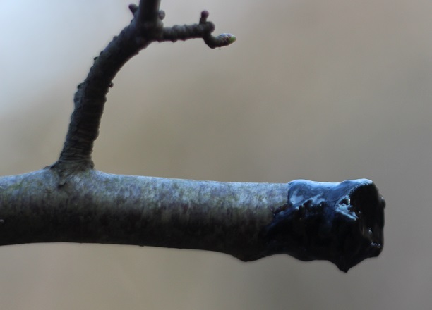 I made a clean fresh cut 6 inches back from the original cut, sterilized with freshly boiled water and brushed on the thick tar.