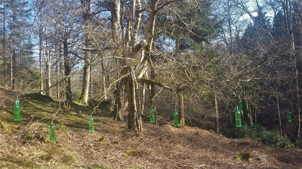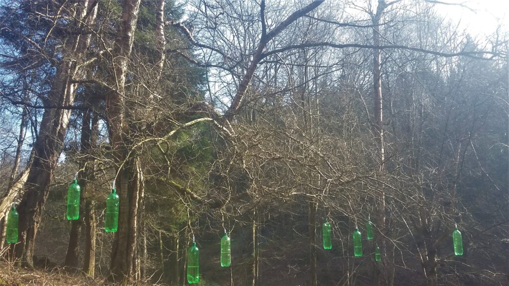 Leave for 12-48 hours, after which time the bottle will most likely be brimming with sap. Alternatively, you can use a small length of tubing or a small elder stick after clearing out the soft central pith, make your own spile,and allow the sap to drip freely into a collecting vessel such as a demijohn – preferably using a muslin covered funnel to direct the liquid and prevent insects falling in. In woods where there are wood ants, the ants will amass around any exposed sap.