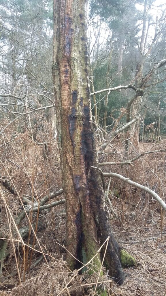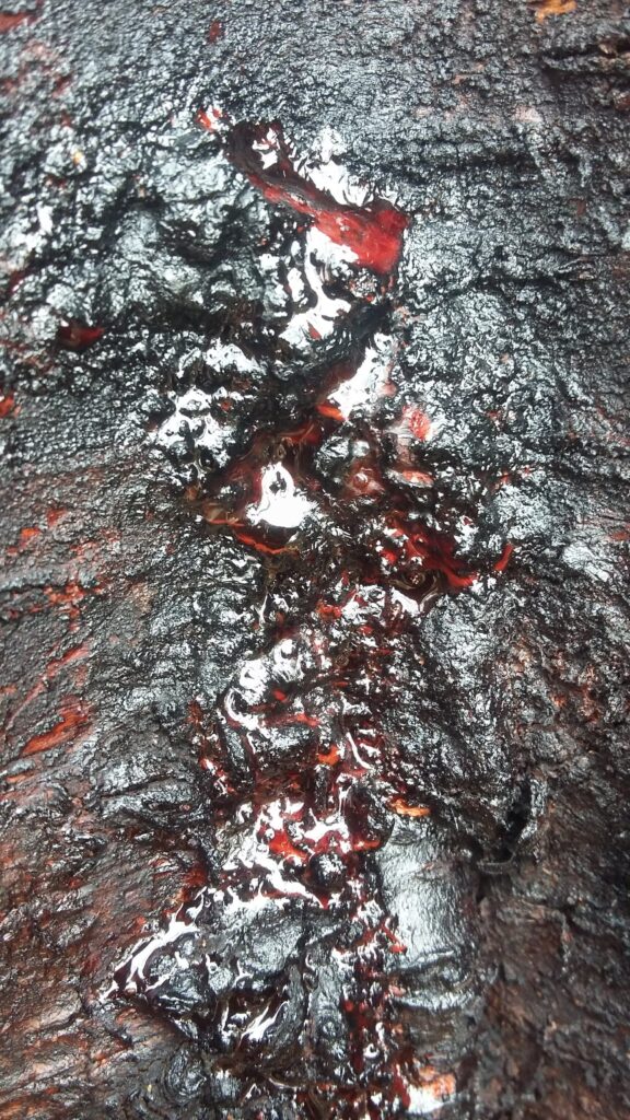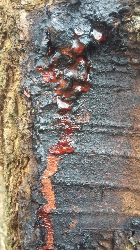 A birch oozing a mixture of resin and sap, best left to heal. Why do trees bleed?