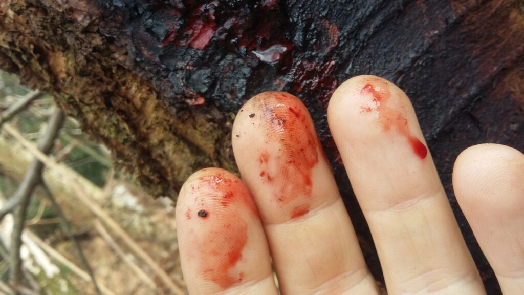 And the following tree. Two days ago it was standing tall in the forest, but today it has fallen and is oozing sap at the break, but let’s look a little closer, the signs that it was not a healthy tree are there….