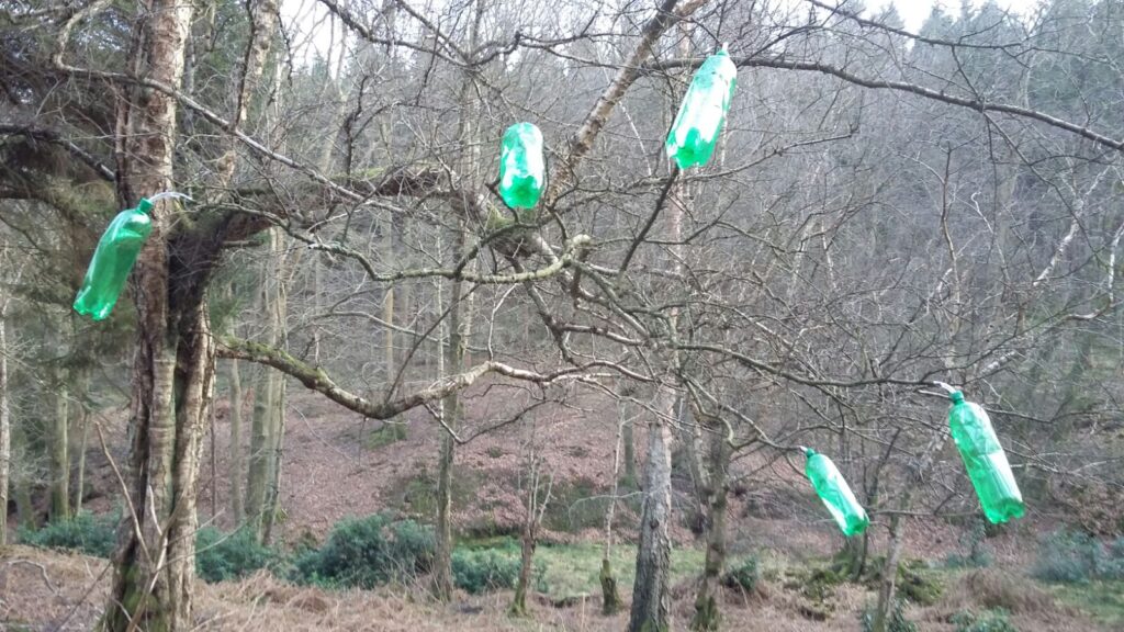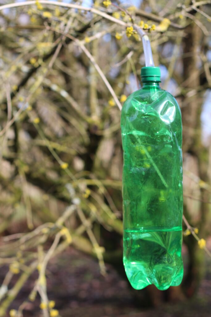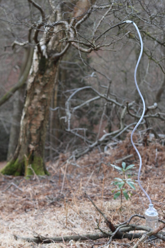 Push one end of the plastic tubing 1-2 cms into the hole so that it is held firmly in place. Place the other end into the collecting bottle, far enough in so that it can’t slip out. Gently pack tissue or cotton wool around the tube at the neck end of the bottle, allowing the air to escape as the bottle fills with sap and to prevent insects from getting in (you can just cut or melt holes into the top of plastic lids – but make sure it isn’t a completely tight fit as you need to allow air to escape from the bottle as it fills up). If using a spile, push and twist to firmly set it in the tree.